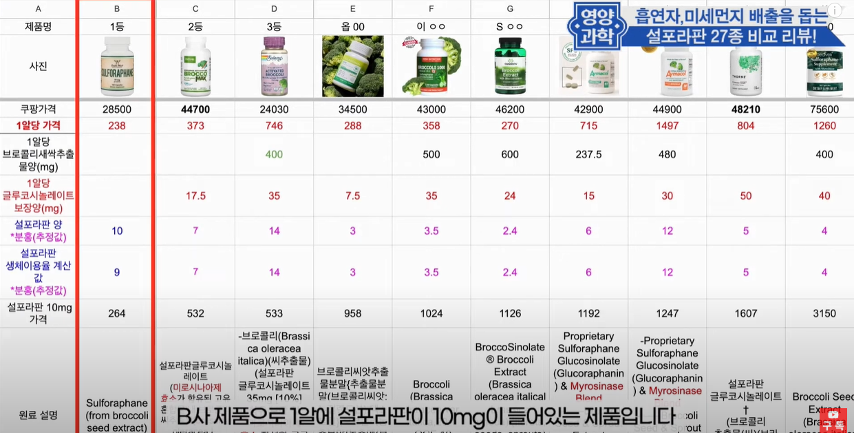 - 가성비 계산: 각 제품의 설포라판 생체 이용률을 계산한 후, 설포라판 10mg이 체내에 들어오려면 얼마의 가격을 지불해야 하는지 계산하여 가장 저렴한 순으로 순위를 매겼다.