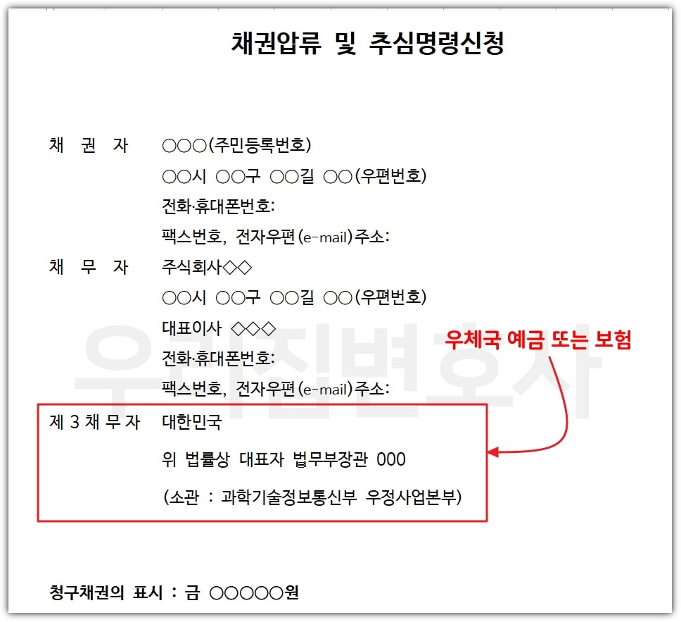 - 압류명령 신청 : 채권자는 채무자의 주소지 관할 지방법원에 압류명령을 신청합니다. 이때 필요한 서류를 준비해야 합니다.