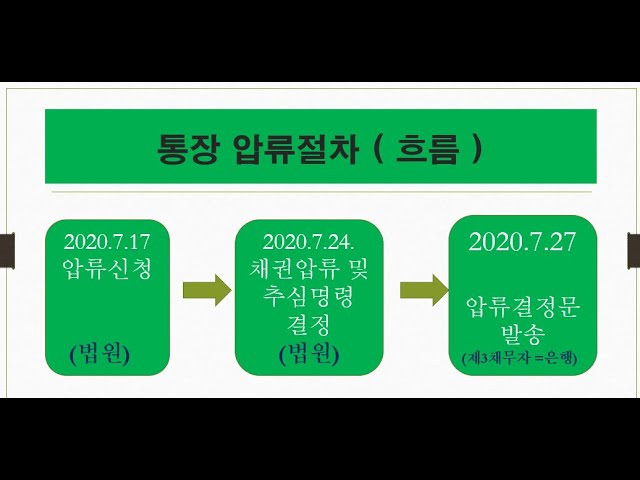 - 통장 압류 실행 : 통지가 완료되면, 채권자는 해당 금융기관에 압류를 요청합니다. 금융기관은 법원의 명령에 따라 통장을 압류하게 됩니다.