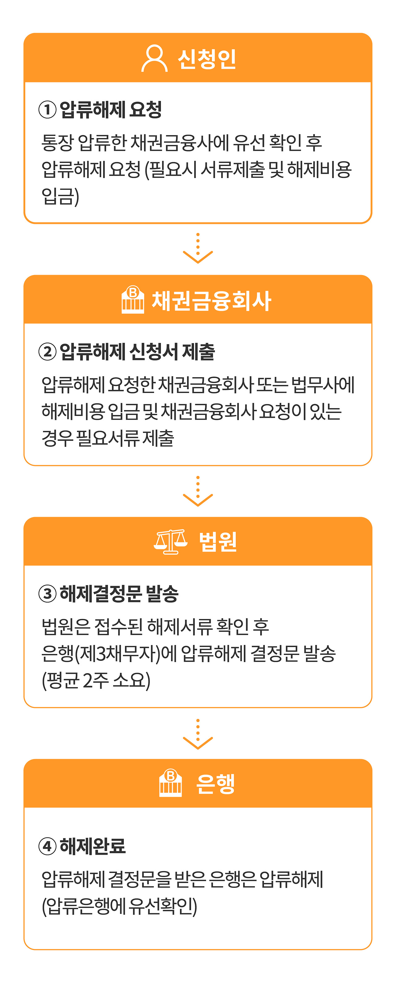 - 해제 결정 통지 : 법원이 압류 해제를 결정하면, 해당 금융기관에 통지하여 통장 압류를 해제합니다.